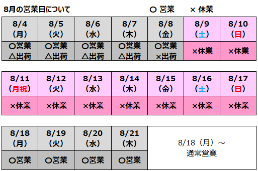 2025年夏季休業日[8/9~8/17]と出荷可能日のお知らせ