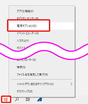 - スタートボタンを右クリックしたら出てくるクイックアクセスメニュー内にある、「電源オプション」をクリック