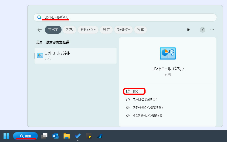 - Windowの検索ウィンドウに、「コントロールパネル」と記載して、コントロールパネルを開いてください。
