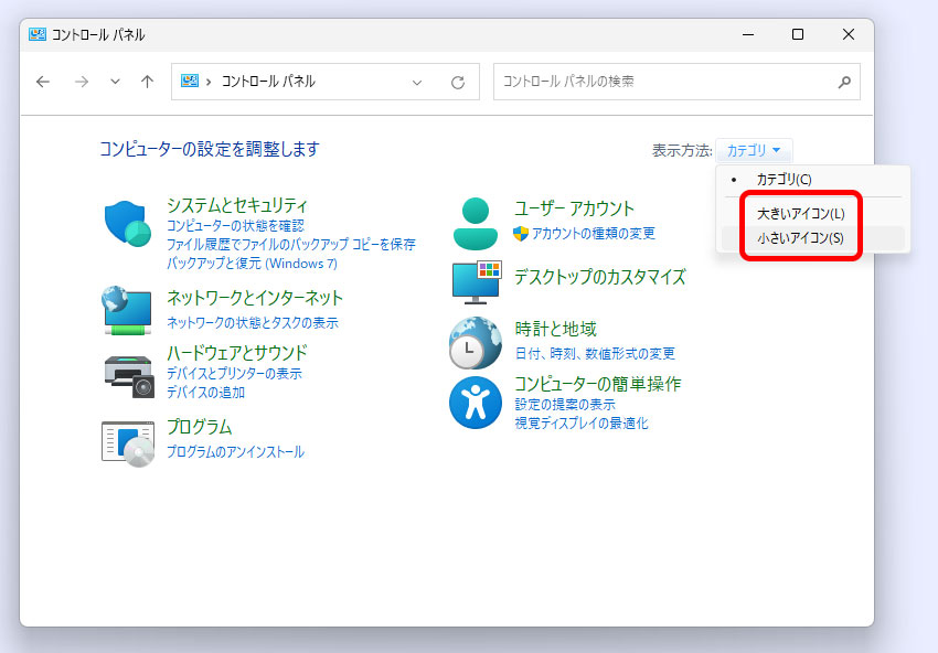 表示方法が「カテゴリ」になっている場合は、大小いずれかの「アイコン」での表示に変更します。