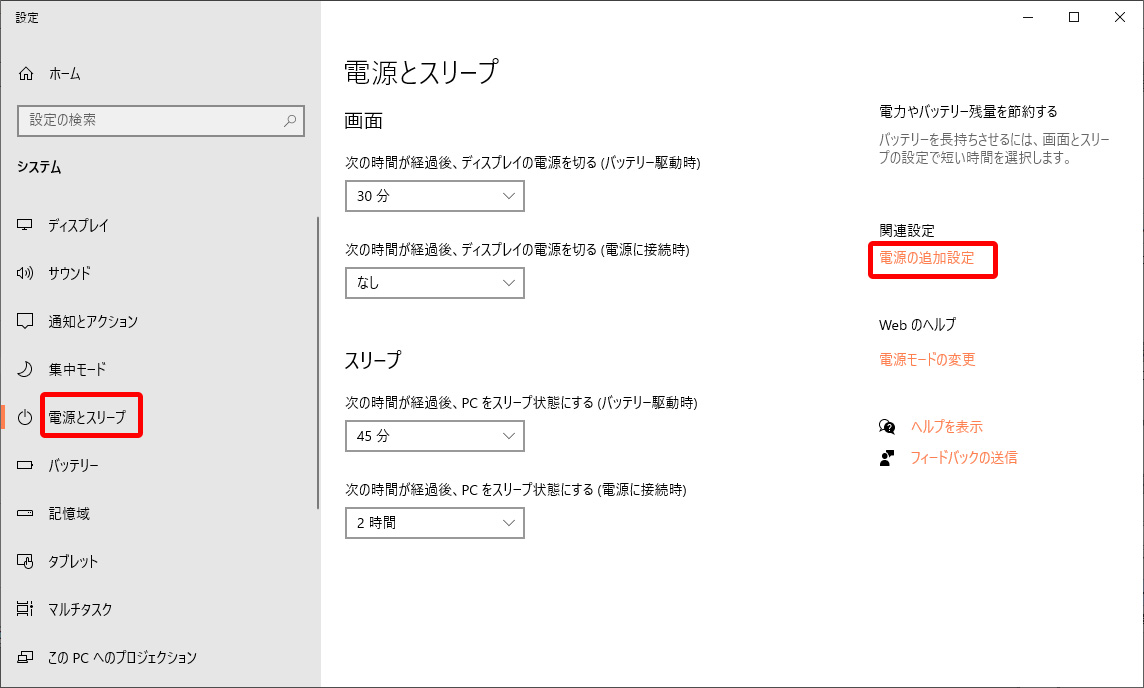 - 「電源とスリープ」設定画面が表示されるので、「電源の追加設定」をクリックします。