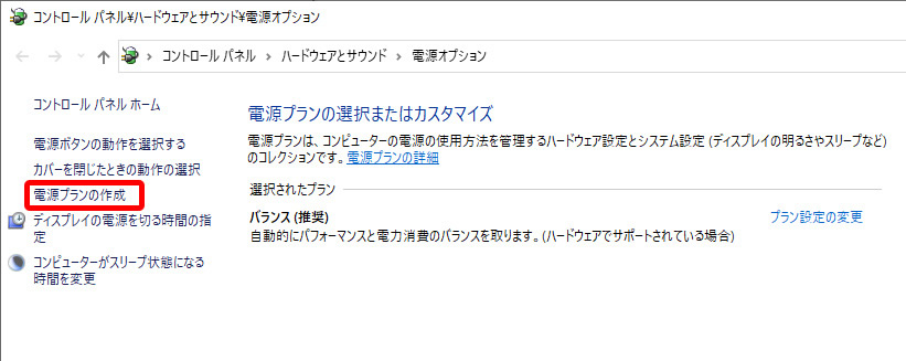 「高パフォーマンス」モードが無い場合は、「電源プランの作成」をクリックします。