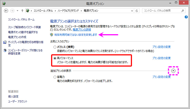 表示されていない場合で、「現在利用可能ではない設定を変更します」等の表示がある場合は、そちらをクリックすることで「高パフォーマンスモード」を選択できるようになる場合があります。