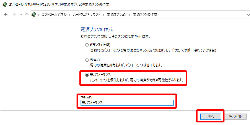 - 「高パフォーマンス」のラジオボタンをクリックし、プラン名を入力し、「次へ」をクリックします。