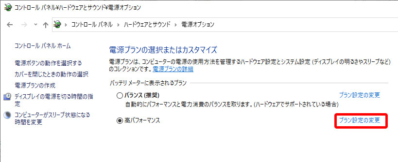 - 先程作成した「高パフォーマンスモード」の「プラン設定の変更」をクリック