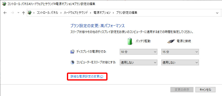 - 「高パフォーマンスモード」内にある「詳細な電源設定の変更」をクリック