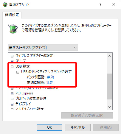 - 「電源オプション」ウィンドウが開くので、その中の「USB設定」のメニュー内の「USBのセレクティブサスペンドの設定」をすべて「無効」にしたのち、「適用・OK」をクリックする。