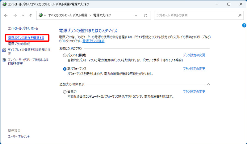 - コントロールパネル内にある「電源オプション」の画面から、「電源ボタンの動作を選択する」のリンクをクリックしてください。