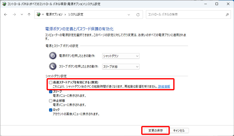 - 「高速スタートアップを有効にする」のチェックを外してから、「変更の保存」をクリックしてください。